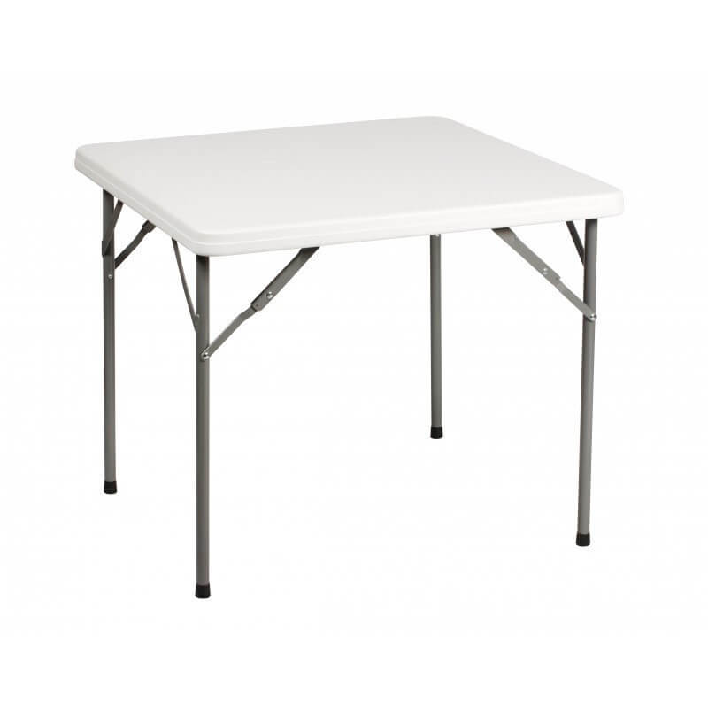 Складываемый стол, который имеет столешницу светлого цвета из армированного пластика, стойкую к ультрафиолету.